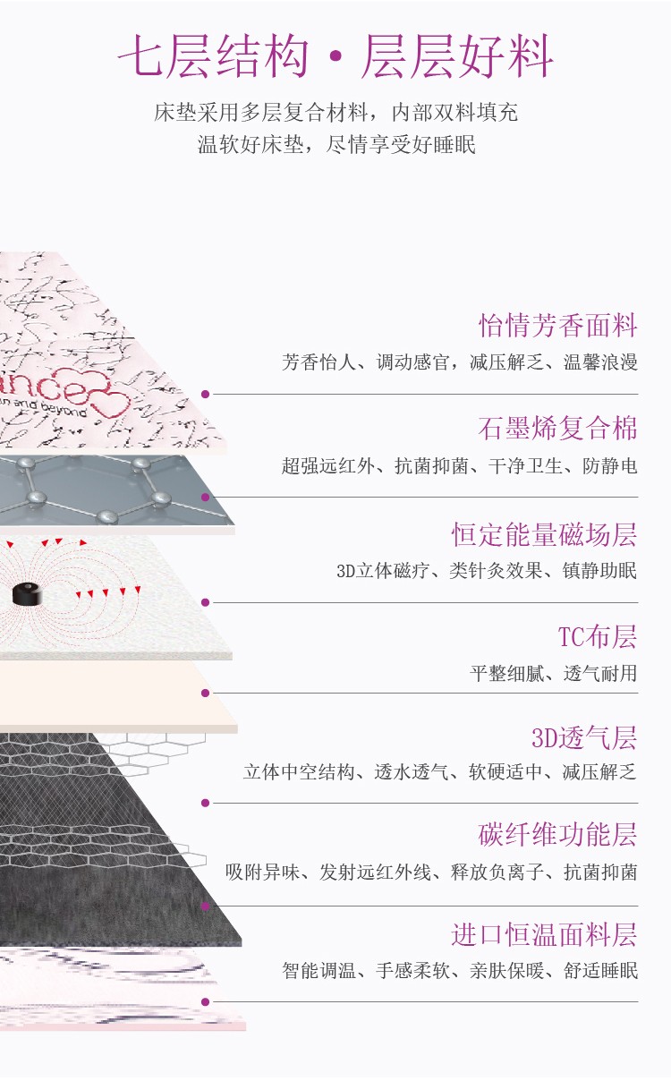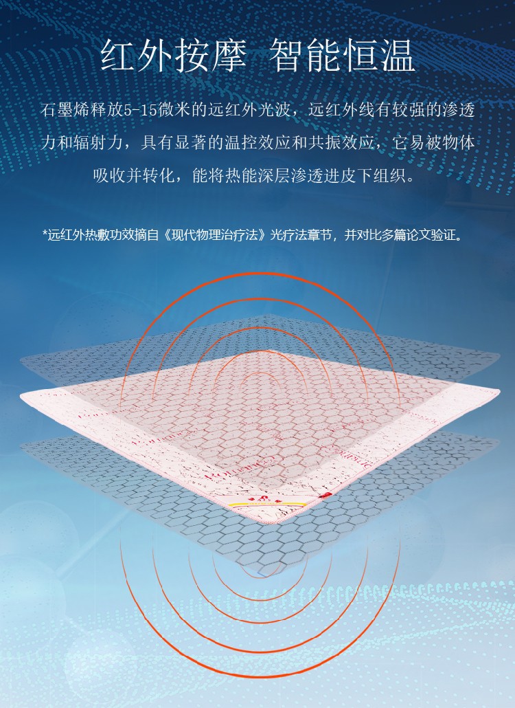 内芯材质:石墨烯功能棉、恒定能量磁场层、高分子3D材料、竹炭纤维棉